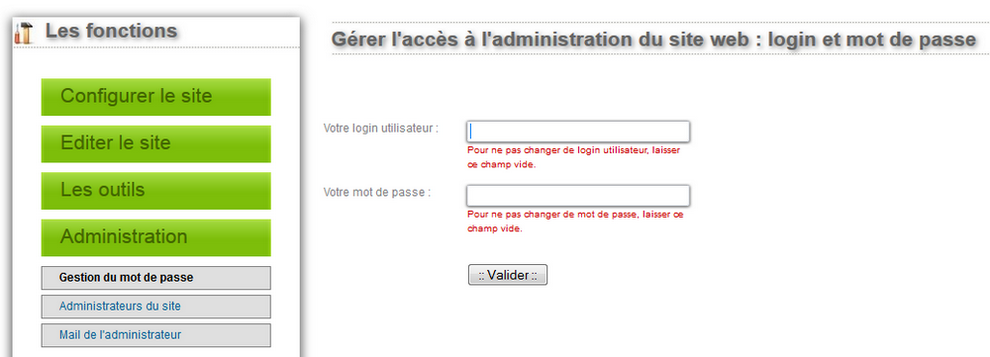 Pour défénir le nouveau login et/ou mot de passe, renseignez les champs, puis cliquez sur le bouton "Valider". Notez que tant que vous ne remplissez pas les champs, ce sont les anciennes données qui seront mémorisées.