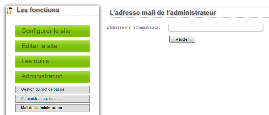 Dans le menu de gauche, rubrique "Administration", cliquez sur "Mail de l'administrateur". Un champ de formulaire vous permet de saisir l'adresse mail qui sera utilisée. Cliquez sur le bouton "Valider".