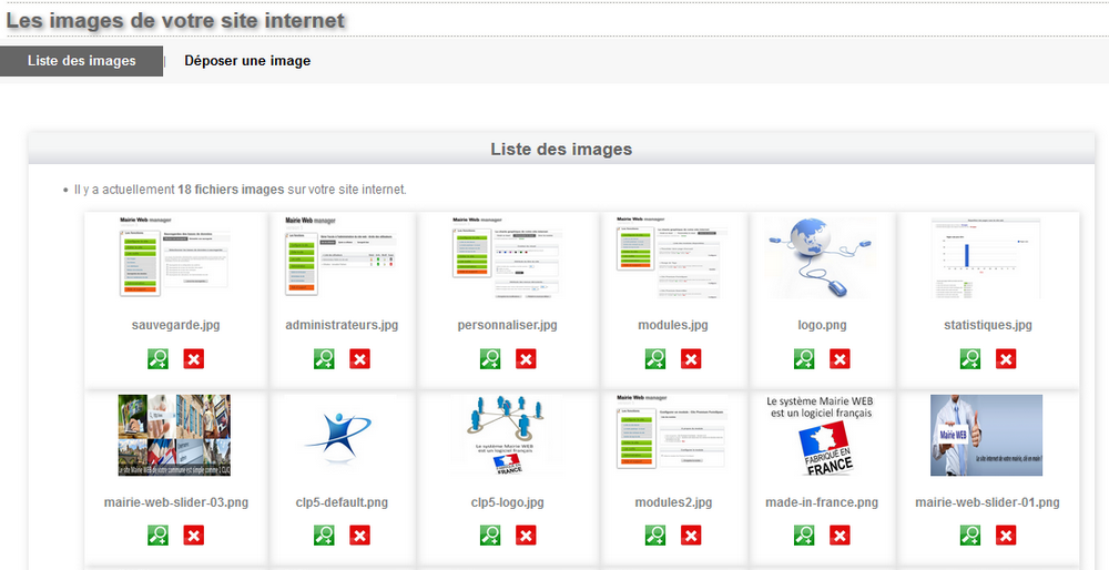 Les images contenues dans le site internetCet outil vous permet d'afficher la liste des images que vous avez téléchargées sur le serveur et que vous utilisez dans votre site internet. Vous visualisez alors sous forme de vignettes la liste des images (fichiers JPEG, PNG ou GIF) que vous avez déjà chargés sur le serveur. Des onglets internes à cette fenêtre vous permettent de naviguer entre la liste des images et la fonction qui permet de déposer une image (télécharger) de votre PC vers le serveur. Vous avez les informations et/ou fonctions suivantes :