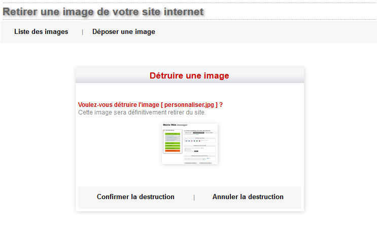 Détruire une imageCette fonction détruit (retire) le fichier image du serveur. Cela veut dire que si vous avez inséré cette image dans une page, elle ne s'affichera plus. Lorsque vous souhaitez détruire une image, cliquez sur le bouton rouge (en-dessous du nom de l'image). Une fenêtre de confirmation s'affichera par mesure de sécurité.