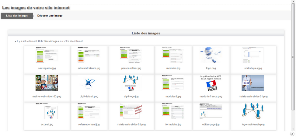 Insérer une image dans la page web (fonction éditeur)Dans ce chapitre, vous trouverez le détail de la seconde méthode pour insérer une image directement dans le texte de votre page (dans l'éditeur de pages). Lorsque vous vous trouvez dans l'éditeur de pages, en cliquant sur l'onglet "Insérer une image", une fenêtre qui s'appelle "Les images de votre site internet" s'ouvre. Vous visualisez alors sous forme de vignettes la liste des images (fichiers JPEG, PNG ou GIF) que vous avez déjà chargés sur le serveur. Des onglets internes à cette fenêtre vous permettent de naviguer entre la liste des images et la fonction qui permet de déposer une image (télécharger) de votre PC vers le serveur.