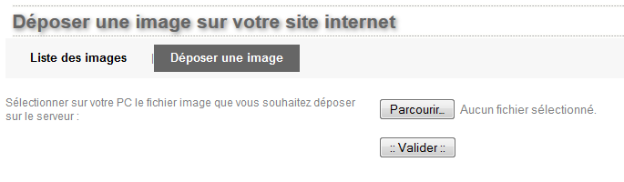 Etape 1 : déposer votre image sur le serveurCette étape n'est utile que si votre fichier image (au format JPEG, PNG ou GIF) n'est pas déjà téléchargée sur le serveur web qui héberge votre site internet. Pour télécharger votre fichier image sur le serveur, cliquez sur l'onglet déposer une image. A l'écran apparaît deux boutons :