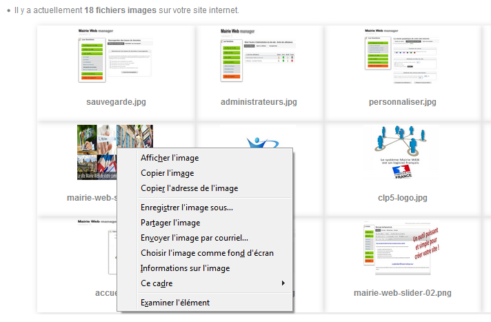 Etape 2 : copier l'image pour l'insérer dans votre pageDans la liste des images, faites un clic droit de la souris sur la vignette de l'image à insérer : une fenêtre s'ouvre avec différentes options, cliquez sur "Copier l'image".