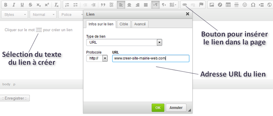 Insérer un lien hypertext dans la pageLorsque vous éditez une page du site internet, vous pouvez avoir besoin d'intégrer un lien vers une autre page du site, un document ou un autre site internet. L'éditeur comporte un outil d'insertion des liens. Un lien peut être un texte ou une image sur lesquels vous cliquez et qui vous redirige vers une autre page, un autre site internet, un document PDF ... La procédure d'insertion est simple :