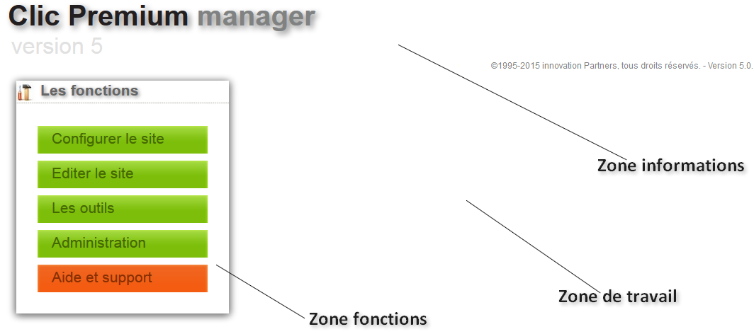 Présentation du Clic Premium ManagerLe système Manager est réparti en plusieurs zones permettant un accès rapide aux différentes fonctions ou informations. Trois zones principales sont identifiées :