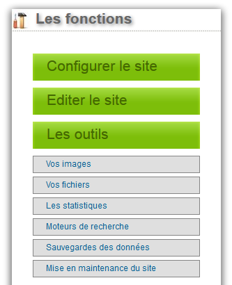 La liste des outils complémentairesLes outils mis à votre disposition dans le Manager regroupent des fonctions ou des utilitaires qui viennent compléter l'édition des pages de votre site. Ces outils vous proposent notamment :
