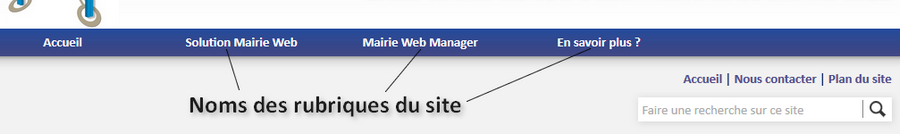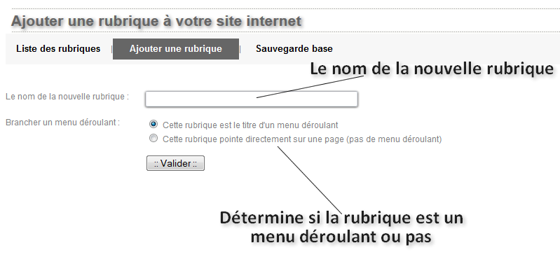 La gestion des rubriquesLa gestion des rubriques est un élément clé car il définit la structure générale du site internet que vous allez créer. Les rubriques apparaitront dans la barre de menu du site internet et sont les portes d'entrées vers les différentes pages du site. Une rubrique peut pointer vers un groupe de pages (réunies automatiquement dans des menus déroulants) ou pointer vers une seule page (dans ce cas, il n'y aura pas de menu déroulant derrière la rubrique).