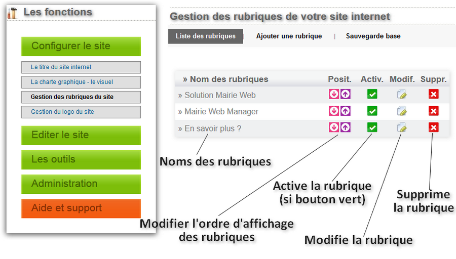 Pour accèder à la gestion des rubriques, dans le menu de gauche cliquez sur "Gestion des rubriques du site". Cette action vous permet d'aller directement sur la liste des rubriques existantes. A ce niveau, vous pouvez effectuer plusieurs actions :