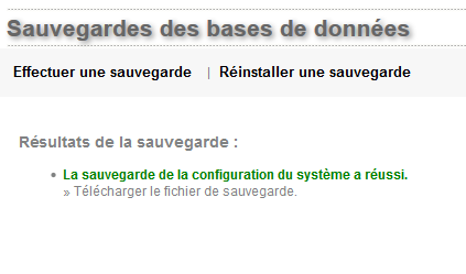 Une fois la procédure de sauvegarde achevée, vous avez un message vous indiquant le résultat : si erreur ou non. Dans le cas où la sauvegarde s'est effectuée avec réussite, vous pouvez télécharger le fichier afin de le conserver sur votre PC ou sur un disque dur externe. Pour cela, cliquez sur le lien.