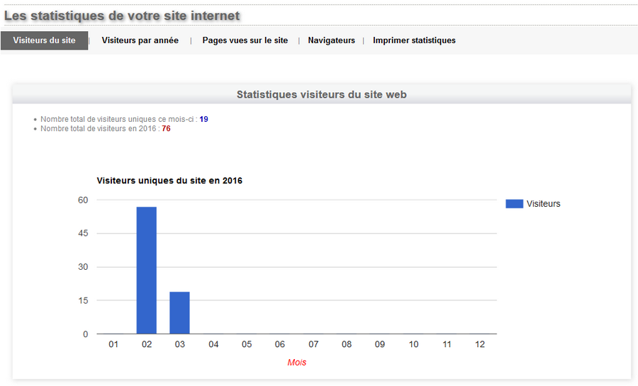 Les statistiques de consultationPour savoir si votre site web est visité et quelles sont les pages les plus vues, nous avons mis en place un système de statistiques basé sur IpStats® (outil développé par innovation Partners). Ainsi vous pouvez connaitre l'évolution et l'intérêt des internautes pour votre site internet. Dans ses statistiques, vous aurez les informations suivantes :