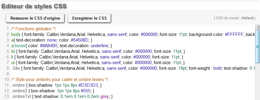 Editeur de styles CSSLes sites web générés par le Manager s'appuient sur des feuilles de styles (CSS). Ces dernières permettent de gérer les éléments d'affichages (par exemple des attributs visuels, des possibilités de mise en page) indépendamment des textes, des tableaux, des liens ou des images que vous intégrez dans vos pages. Lorsque vous êtes un administrateur du site avec les droits de "Super Administrateur", vous avez la possibilité d'éditer le CSS correspondant au thème (visuel) que vous utilisez. Attention : la modification des styles CSS de votre site web est à effectuer avec précaution (s'adresse à des connaisseurs). En effet, vous devez connaitre la syntaxe et les codes de CSS3, et respecter quelques régles dans l'édition de la feuille de style, sinon vous risquez tout simplement de casser ou d'endommager l'affichage de votre site internet. Dans la fonction "Editer le site", faites le choix "Editeur de styles CSS" pour entrer dans l'éditeur de la feuille de style de votre site web.