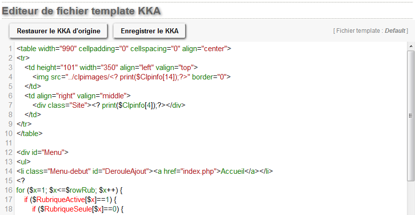 Editeur de templates KKALes sites web générés par le Manager s'appuient sur des templates (KKA). Ces derniers permettent de gérer la mise en page et l'affichage des pages et de leur contenu (par exemple le positionnement d'un élément ou d'un module dans une page). Lorsque vous êtes un administrateur du site avec les droits de "Super Administrateur", vous avez la possibilité d'éditer le template correspondant au visuel que vous utilisez. Attention : la modification des templates de votre site web est à effectuer avec précaution (s'adresse à des connaisseurs). En effet, vous devez connaitre la syntaxe et les codes de type HTML et/ou PHP, et respecter quelques régles dans l'édition template, sinon vous risquez tout simplement de casser ou d'endommager l'affichage de votre site internet. Dans la fonction "Editer le site", faites le choix "Editeur de template KKA" pour entrer dans l'éditeur du template.