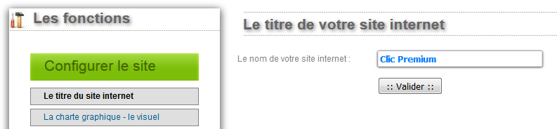 Définir le titre du site webPremière étape de la création de votre site web, le titre du site web est important car il sera utilisé dans le titre de chacune des pages du site (affiché dans les navigateurs), et donc il pourra être utile pour le référencement sur les moteurs de recherche. Le titre du site web apparaitra également dans chacune des pages que vous allez créer dans votre site internet. Dans le formulaire, saisir le titre du site et cliquez sur le bouton "Valider".